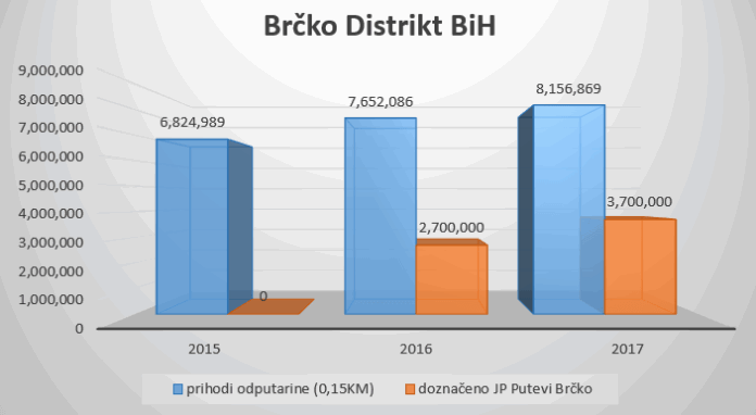 Republika Srpska i Federacija BiH uzimaju 28% – 29% prihoda od putarine za krpljenje budžetskih rupa, dok Brčko distrikt 72% prikupljene putarine u posmatranom periodu nije usmjerio nadležnom Javnom preduzeću Putevi Brčko. Bez obzira što je Zakonom o putevima Brčko distrikta (član 57.) jasno definisano da je novac od naknade za puteve iz maloprodajne cijene goriva prihod J.P. Putevi Brčko, ovo preduzeće u 2015. godini nije dobilo ni jednu marku.