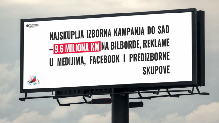 Političke stranke u BiH potrošile su do sada na izbornu kampanju oko 9,6 miliona KM, pokazuju preliminarni podaci Transparency International u Bosni i Hercegovini (TI BIH). Ovaj iznos potrošen je na bilborde, reklame u medijima (televizija i štampani mediji), Facebook oglašavanje i predizborne skupove.