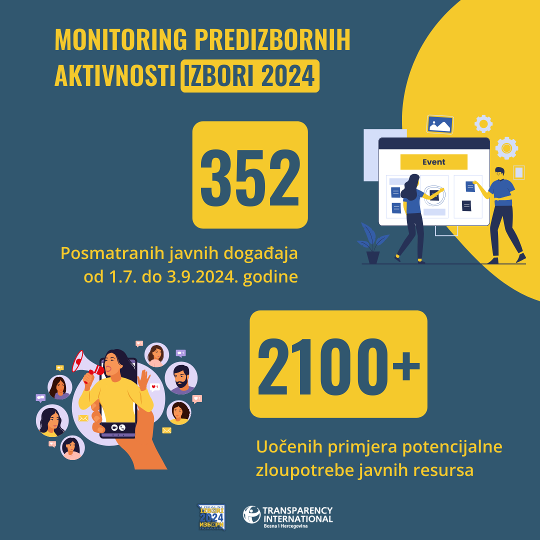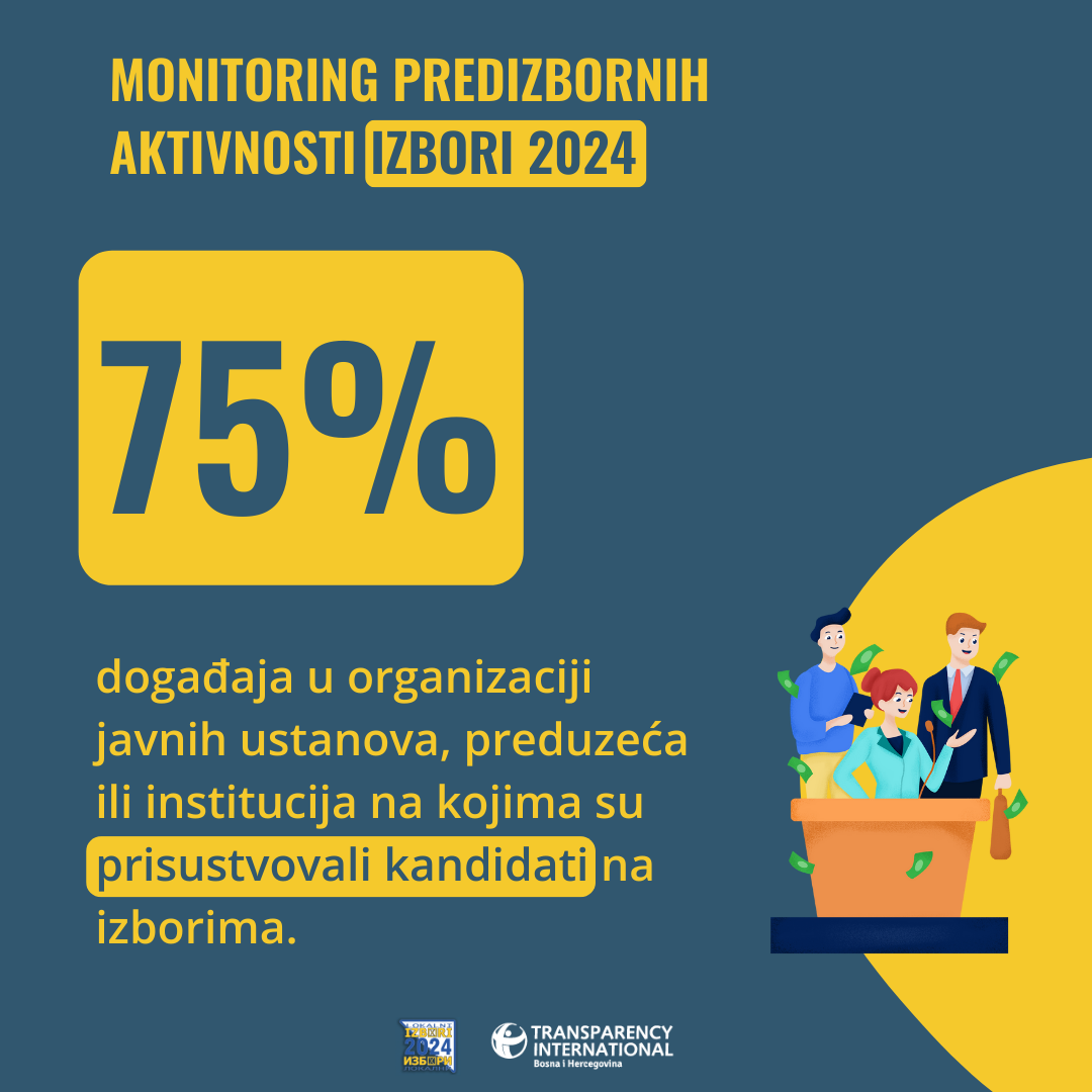 TI BIH već dugo ukazuje na problem izbornih uslova u BiH, jer nekažnjena zloupotreba javnih resursa daje značajnu prednost kandidatima na vlasti. Posljednjim izmjenama koje je nametnuo visoki predstavnik ove zloupotrebe su samo djelimično sankcionisanje, ali zbog nepostojanja tumačenja i uske primjene, ove odredbe za sada nisu dale očekivane rezultate. Ono što je pozitivno pomenuti jeste povećano interesovanja građana za izborni proces, a TI BIH je samo putem aplikacije Reflektor primio 878 prijava građana vezanih za pokušaje uspostave političke kontrole nad biračkim odborima, preuranjenu kampanje i zloupotrebu javnih sredstava.