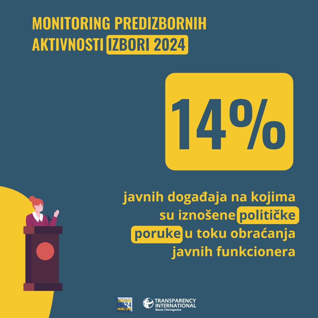 Nastavljena je i praksa funkcionerske kampanje, a posmatrači TI BIH ispratili su u protekla dva mjeseca 350 događaja u organizaciji javnih institucija. Na preko 75% takvih događaja prisutni su bili izborni kandidati, na 14% događaja iznošene su političke poruke, iako se po zakonu i ovo smatra zloupotrebom javnih resursa. Još se čekaju odluke po prijavama protiv poslanika u NSRS i nosioca liste SNSD-a u Banjaluci Vlade Đajića koji je slao predizborne poruke na nekoliko javnih događaja, a isti kandidat je kao i u prethodnim izbornim ciklusima započeo preuranjenu kampanju preko bilborda gdje nudi besplatne preglede penzionerima.