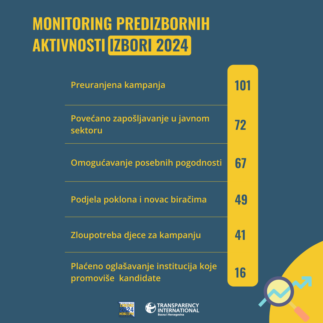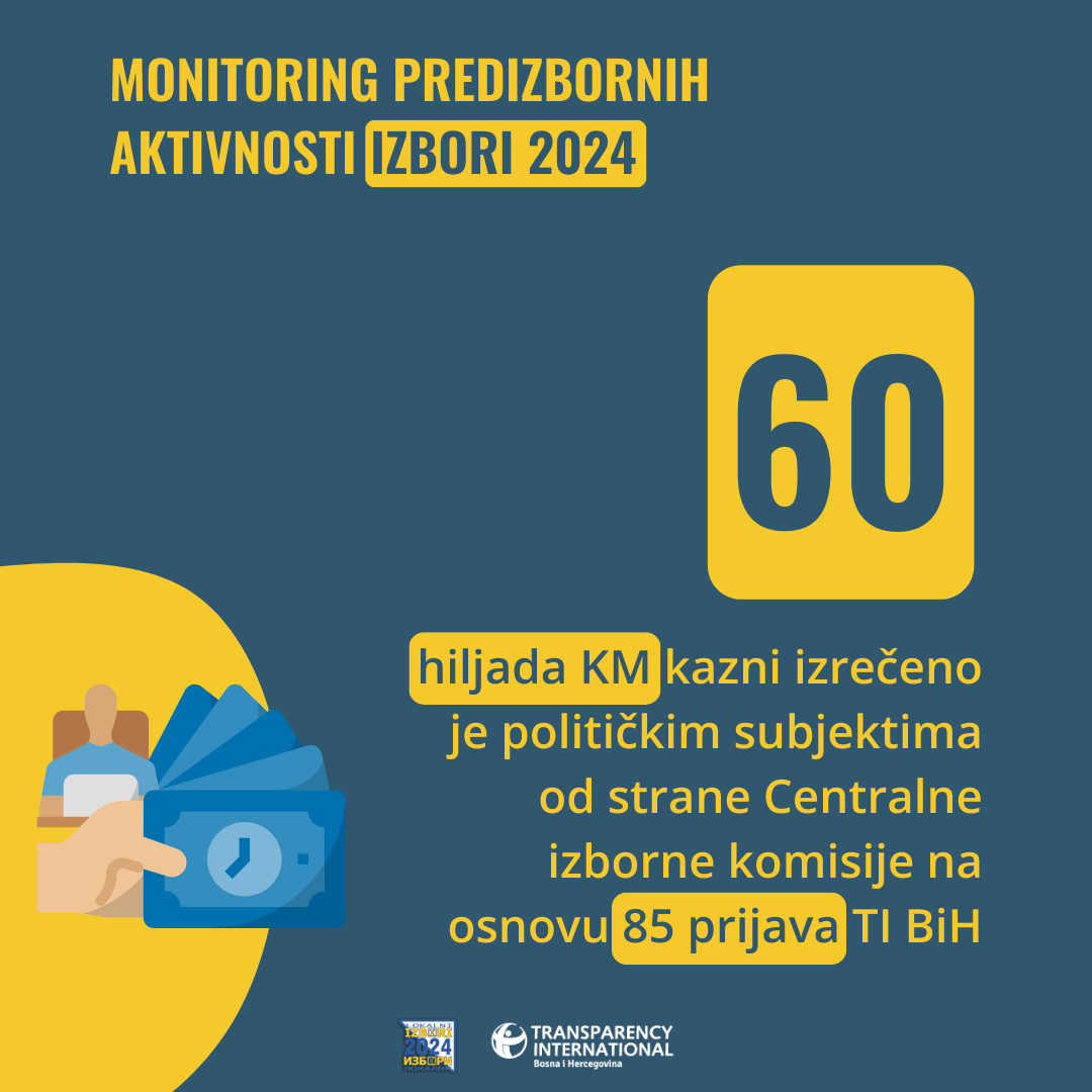 U posljednja dva mjeseca Transparency International u BiH (TI BiH) podnio je 90 prijava vezanih za kršenje izbornog zakonodavstva. CIK je do sada po prijavama TI BiH izrekao 14 sankcija u ukupnom iznosu od 59.500 KM koje se u najvećoj mjeri odnose na preuranjenu kampanju, dok i dalje izostaju sankcije za zloupotrebu javnih resursa. Za dva mjeseca predizbornog perioda kroz jednokratne davanja penzionerima i drugim kategorijama najčešće od 50, 100 ili 200 KM, svi nivoi vlasti podijelili su oko 53 miliona KM po podacima TI BiH.
