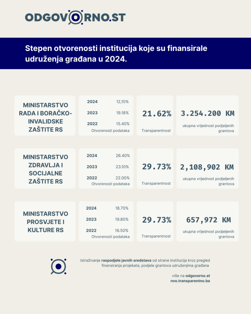 Ovaj apsurd najbolje ilustruje razmjere političkog uticaja na organizacije koje primaju javna sredstva. Najviše novca dijeli Ministarstvo rada, i boračko invalidske zaštite RS koje po podacima platforme Odgovorno.rs značajno smanjuje indeks otvorenosti podataka. Tu treba napomenuti da uprkos tri sudske presude ovo ministarstvo i dalje nije dostavilo TIBIH-u podatke o nenamjenskom trošenju javnog novca od strane boračkih organizacija koje su dobijale sredstva prethodnih godina a trošila ih prema ocjeni revizora “na isplate plata i materijalnih troškova, a ne za realizaciju programskih aktivnosti i konkretnih projekta “ .