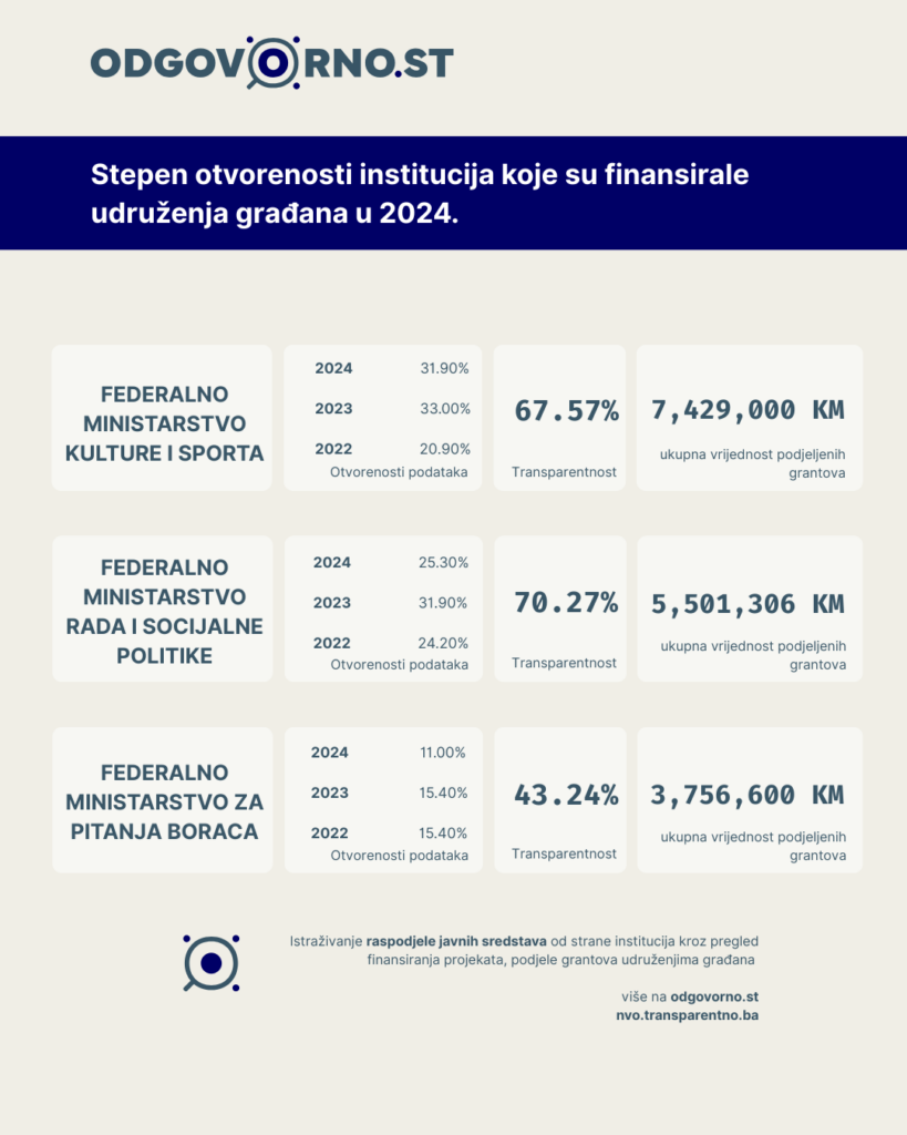 Transparentnost podjele grantova nevladinim organizacijama još je manja na entitetskom nivou gdje se indeks otvorenosti podataka značajno smanjuje u institucijama koje dijele najveći iznos sredstava.